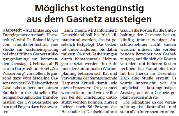 Nachstehend können Sie einige Berichte aus verschiedenen Lokalzeitungen unserer Region nachlesen: Mit freundlicher Genehmigung zur Veröffentlichung durch die:Kreiszeitung für den Bereich Harpstedt Kreiszeitung vom 17.03.2026PV – Die Zeit könnte knapp werden Kreiszeitung vom 07.02.2026Gasnetze verlieren an Bedeutung Sonntagsblatt vom 07.02.2026Möglichst kostengünstig aus dem Gasnetz aussteigen Kreiszeitung vom 04.09.2025Noch einmal vier Prozent Dividende Kreiszeitung vom 30.08.2025Ankündigung der Generalversammlung Kreiszeitung vom 23.08.2025Umweltfreundlich und gefördert Kreiszeitung vom 17.03.2025Bericht über die Veranstaltung „Aller-Auto – Vorbild für Harpstedt?“ Kreiszeitung vom 07.03.2025Vorschau auf die Veranstaltung der Energiegenossenschaft „Erfahrung mit Carsharing“ Sonntagsblatt vom 08.03.2025Das Auto für alle Kreiszeitung vom 07.02.2025Bericht über die Veranstaltung „Wind of Change“ Kreiszeitung vom 30.01.2025Vorschau auf die Veranstaltung der Energiegenossenschaft „Wind of Change“ Kreiszeitung vom 16.01.2025Vorschau auf die Veranstaltung der Energiegenossenschaft „Wärmepumpe für das eigene Haus“ Kreiszeitung vom 18.01.2025Vorschau auf die Veranstaltungen der Energiegenossenschaft in 2025 Kreiszeitung vom 12.07.2024Manuela Schöne referierte zum Klimaschutz im Landkreis Oldenburg Kreiszeitung vom 11.07.2024Bericht zur Generalversammlung der Energiegenossenschaft Harpstedt eG Kreiszeitung vom 27.02.2024Rentiert sich eine PV-Anlage?Vortrag gibt Entscheidungshilfen Kreiszeitung vom 25.01.2024„Königsdisziplin“ der Energiewende Kreiszeitung vom 20.11.2023Bericht zum Vortrag „Mit dem E-Auto zum Polarkreis“ Kreiszeitung vom 20.09.2023Bericht zur Generalversammlung Kreiszeitung vom 21.06.2023Beitrag zum Klimaschutz NWZ vom 21.06.2023Anlage ist produktiver als gedacht Kreiszeitung vom 31.03.2023Die Genossenschaft fühlt sich ausgebremst Sonntagsblatt vom 08.04.2023Energiegenossenschaft fühlt sich ausgebremst Kreiszeitung Weyhe vom 09.03.2023Reges Interesse beim Vortrag in Weyhe Kreiszeitung vom 15.10.2022Carsharing und Bürgerwindrad im Visier NWZ vom 15.10.2022Wo Potential vorhanden ist Kreiszeitung vom 19.03.2022281 Fotovoltaikmodule auf den Baddächern montiert Sonntagsblatt vom 26.03.2022Genossenschaft lässt 281 Solarmodule installieren Kreiszeitung vom 10.03.2022Carsharing und Windrad NWZ vom 10.03.2022Solarstrom fürs Rosenfreibad Kreiszeitung vom 13.07.2021Info-Veranstatung ausgebucht Kreiszeitung vom 10.07.2021Anmeldung für Info-Veranstaltung nötig Sonntagsblatt vom 24.07.2021Wegen Corona nur 25 Teilnehmer zur Info-Veranstaltung erlaubt Kreiszeitung vom 05.07.2021Die Genossenschaft (in Gründung) plant die erste Fotovoltaikanlage Sonntagsblatt vom 10.07.2021Erstes Großprojekt im Freibad geplant Wildeshauser-Anzeiger vom 10.07.2021Klimaziele erreichen … Kreiszeitung vom 25.07.2020Die Gründungsidee … Hier können Sie einen Bericht über unsere PV-Anlage vom Rosenfreibad Harpstedt aus dem Genossenschaftsmagazin Weser-Ems, Ausgabe 08/2022 lesen.Für den Download bitte hier klicken …